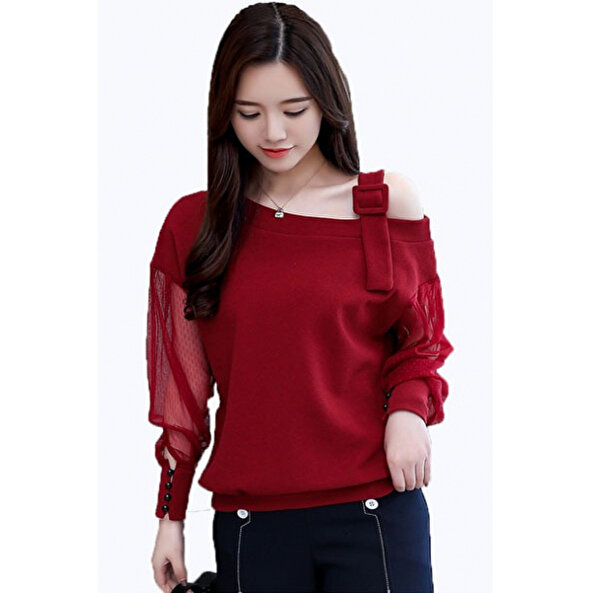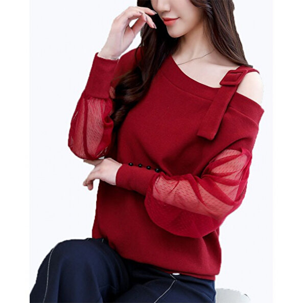 KADIN KIRMIZI OMUZ DETAYLI BLUZ